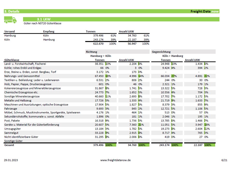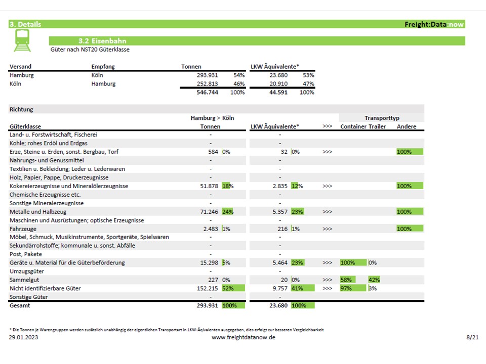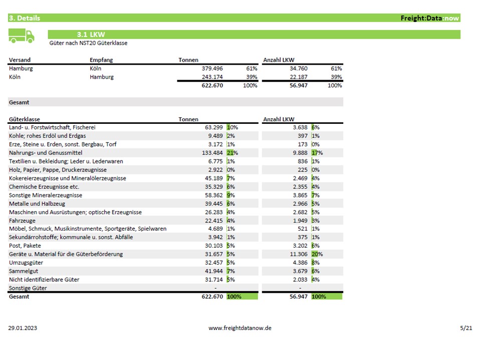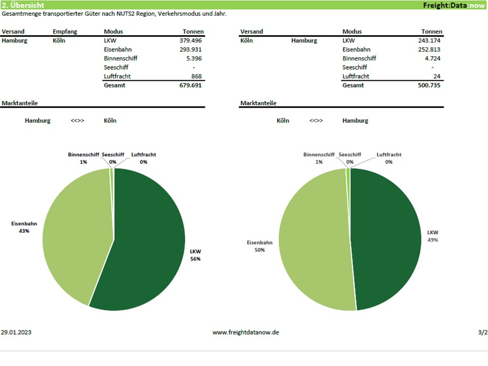 Analyse von Güterverkehrsströmen zwischen zwei NUTS3-Regionen. Ideal zur Identifikation von Logistikpotenzialen und als datenbasierte Entscheidungsgrundlage sowie Vertriebsunterstützung.